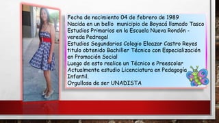 Este documento presenta una biografía de M. Patricia Naranjo Fuentes. Detalla su fecha de nacimiento, lugar de nacimiento, estudios primarios y secundarios, y su título obtenido. Actualmente estudia una licenciatura y trabaja como auxiliar pedagógica. Está casada y tiene un hijo. Agradece a Dios por su vida y familia, y por las oportunidades de superarse profesionalmente.