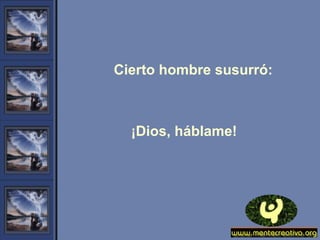 El documento narra la historia de un hombre que le pide repetidamente a Dios que le hable, le permita verlo, le muestre un milagro o lo toque, pero el hombre no escucha ni nota las señales que Dios le envía a través de la naturaleza. A pesar de que Dios finalmente toca al hombre, este espanta una mariposa y continúa su camino sin darse cuenta de la bendición. El documento concluye diciendo que no debemos perdernos las bendiciones de Dios solo porque no llegan de la manera que