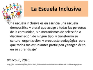 El documento propone un modelo de escuela inclusiva que acoge a todas las personas sin discriminación, transformando su cultura, organización y enseñanza para que todos los estudiantes participen y tengan éxito en el aprendizaje. El modelo busca formar ciudadanos creativos, líderes, con capacidad de comunicarse y aprender de por vida para que ejerzan su libertad con responsabilidad. El enfoque pedagógico incluye metodologías activas, proyectos, consultas a la comunidad y un análisis de programas enfocado en desar