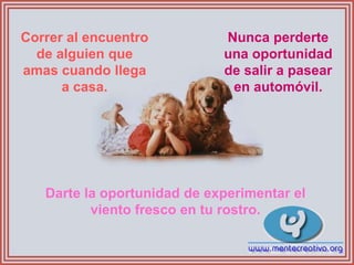Este documento ofrece consejos para perros sobre cómo comportarse de manera positiva y saludable. Algunos consejos incluyen correr para recibir a sus dueños, disfrutar de paseos en automóvil, mostrar afecto a pesar de ser lastimados, y brindar consuelo silencioso a quienes están tristes. El documento enfatiza la importancia de la lealtad y la verdadera amistad.