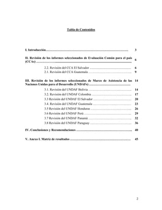El documento revisa los CCAs y UNDAFs de varios países de Latinoamérica para analizar cómo abordan las cuestiones indígenas. El CCA de El Salvador no menciona específicamente a los pueblos indígenas ni incluye datos desagregados. Si bien identifica desafíos que afectan a los indígenas como la pobreza y exclusión, no analiza las causas de sus problemas. Tampoco se describe la participación indígena en su elaboración. El documento concluye resaltando la oportunidad de incluir más las