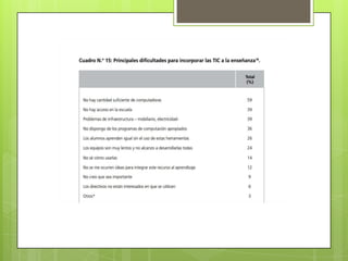 El documento habla sobre los docentes y los cambios en la cultura digital. Menciona que el 96% de los maestros consideran importante que los estudiantes aprendan a usar computadoras en la escuela, pero que el 46% de los docentes no las usa por temor a dañarlas o por no saber cómo manejarlas. También indica que las escuelas tienen más acceso a computadoras con internet para docentes que para estudiantes, y que los niños y jóvenes aprenden a usar las tecnologías más fácilmente que los adultos. Finalmente, inclu