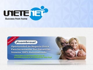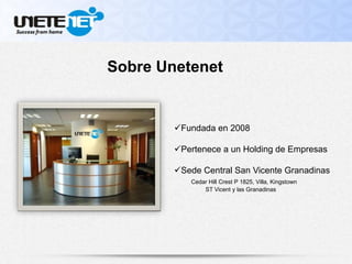 Este documento resume la empresa Unetenet, fundada en 2008 y con sede en San Vicente y las Granadinas. Ofrece dos líneas de negocio, franquicias y afiliados, a través de las cuales las personas pueden ganar ingresos activos y pasivos publicando anuncios. La compañía ofrece varios planes y franquicias, así como bonos y un plan de carrera. El objetivo es ayudar a las personas a alcanzar la libertad financiera trabajando desde casa.