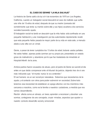 Genie fue descubierta a los 13 años después de haber sido encadenada a una silla en una habitación durante la mayor parte de su vida. No podía hablar ni caminar y presentaba un grave estado de malnutrición y abandono. Sus padres fueron acusados de abuso, pero su padre se suicidó antes del juicio.
