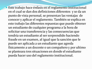 El documento resume el reglamento institucional de una universidad. Explica que el reglamento establece los deberes y derechos de estudiantes, profesores y administración. Detalla los procesos de transferencia entre programas y las sanciones por fraude académico y agresión física. Resalta la importancia de que estudiantes y personal conozcan el reglamento para saber qué se espera de ellos y evitar posibles consecuencias.