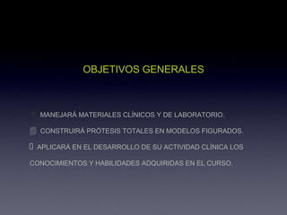 Este documento presenta la introducción a un curso de Prostodoncia I. Incluye los objetivos generales del curso, el equipo e instrumental necesario, el temario, la bibliografía recomendada y la forma de evaluación. También resume brevemente la historia de la Prostodoncia Total dividiéndola en cuatro períodos y define los conceptos básicos de esta disciplina odontológica.