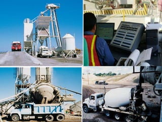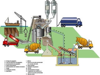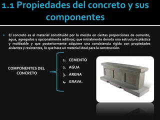 Este documento presenta información sobre los procesos constructivos del concreto, incluyendo las propiedades y componentes del concreto, las mezclas en el lugar y en planta, el transporte y colocación del concreto, y los tipos de juntas de construcción. Describe los estados del concreto, desde el estado fresco hasta el endurecido, y ofrece detalles sobre cómo manejar el concreto en climas calurosos.