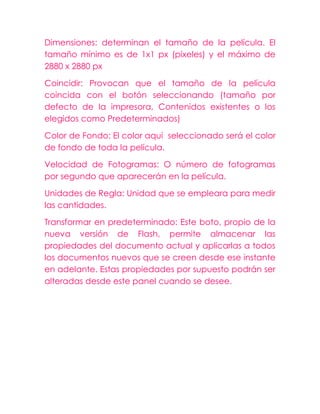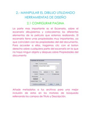 El documento proporciona instrucciones para manipular dibujos y objetos en un programa de diseño como Flash. Explica cómo configurar la página y las propiedades del escenario, crear y editar dibujos utilizando herramientas como línea y lápiz, convertir objetos en símbolos, importar y exportar imágenes, y separar dibujos e imágenes en un programa de diseño.