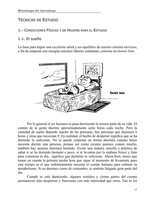 El documento proporciona recomendaciones sobre técnicas de estudio efectivas. Resalta la importancia de dormir bien, hacer ejercicio físico regularmente y estudiar bajo buena iluminación, ya sea natural o artificial, para lograr un mejor rendimiento académico. También enfatiza la necesidad de establecer hábitos regulares antes de dormir para facilitar un sueño profundo y reparador.