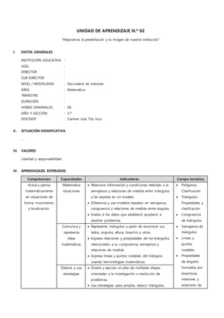 Este documento presenta una unidad de aprendizaje sobre triángulos y polígonos. La unidad consta de 10 sesiones que abordan temas como la clasificación de polígonos y triángulos, sus propiedades, líneas y puntos notables, semejanza y congruencia. El objetivo es que los estudiantes aprendan a representar, analizar y resolver problemas relacionados a triángulos. Al final, los estudiantes aplicarán sus conocimientos para construir un papalote poligonal.