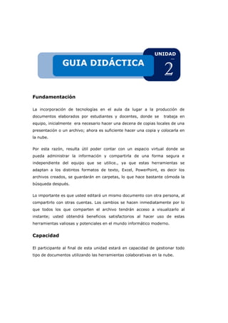Este documento proporciona una guía sobre el uso de herramientas colaborativas en la nube como Google Drive, Dropbox y SlideShare. Explica cómo crear y compartir documentos, carpetas y presentaciones en la nube para que puedan ser editados en tiempo real por múltiples usuarios de forma segura e independiente del dispositivo. También incluye instrucciones detalladas sobre cómo registrarse y utilizar las funciones básicas de estas herramientas para administrar archivos de forma remota.