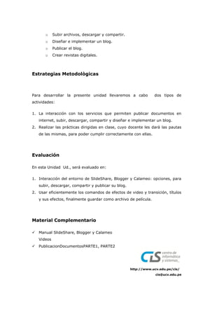 1) El documento habla sobre cómo publicar documentos digitales en la nube, crear y publicar documentos usando servicios como SlideShare, Blogger y Calameo. 2) Explica cómo crear y personalizar un blog usando Blogger e incluir gadgets, encuestas y códigos externos. 3) También cubre cómo crear revistas digitales usando Calameo.
