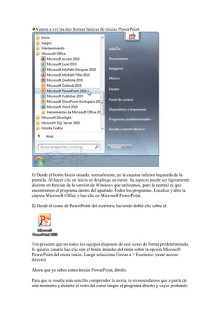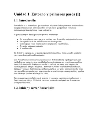 Este documento presenta una introducción al software PowerPoint. Explica que PowerPoint se utiliza para crear presentaciones visuales y atractivas para comunicar información e ideas. Luego describe cómo iniciar y cerrar PowerPoint y cambiar entre las diferentes vistas como la vista normal, clasificadora y de presentación.