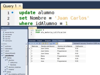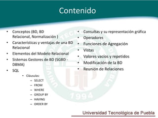 Este documento presenta conceptos básicos sobre bases de datos relacionales y el lenguaje SQL. Explica elementos clave como tablas, filas, columnas, claves primarias y foráneas. También cubre consultas SQL utilizando cláusulas como SELECT, FROM, WHERE, GROUP BY y ORDER BY, así como funciones de agregación como COUNT, SUM, AVG, MIN y MAX. El objetivo es proporcionar una introducción al modelado de datos y la manipulación avanzada de datos con SQL.