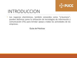 Este documento describe los conceptos de e-business (negocios electrónicos) y e-commerce (comercio electrónico). Explica que los e-business utilizan las tecnologías de la información para apoyar todas las actividades empresariales, permitiendo una mayor integración y eficiencia. Define el e-commerce como la compra y venta de productos y servicios a través de Internet u otras redes, y discute cómo ha crecido gracias a la expansión de Internet. Finalmente, concluye que tanto los e-business como el e-commerce se enfocan en usar