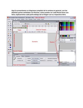 Este documento describe los elementos principales de la ventana de Flash. Identifica 8 elementos clave: 1) la barra de menús, 2) la barra de herramientas, 3) el panel de color, 4) la biblioteca, 5) la línea de tiempo, 6) el escenario, 7) el área de trabajo, y 8) las propiedades. Explica brevemente la función de cada uno de estos elementos centrales de la interfaz de usuario de Flash.