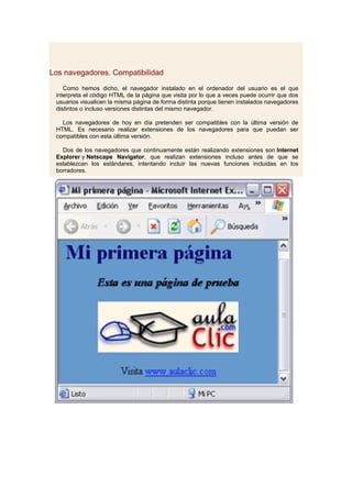 HTML es el lenguaje usado para crear páginas web. Consiste en etiquetas que definen el contenido y estructura de una página, como texto, imágenes y videos. Los navegadores interpretan el código HTML para mostrar la página al usuario. Existen diferentes versiones de HTML que añaden nuevas funciones. Los editores permiten crear páginas web de forma visual sin necesidad de escribir código.