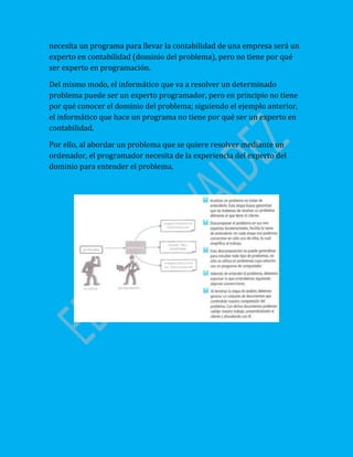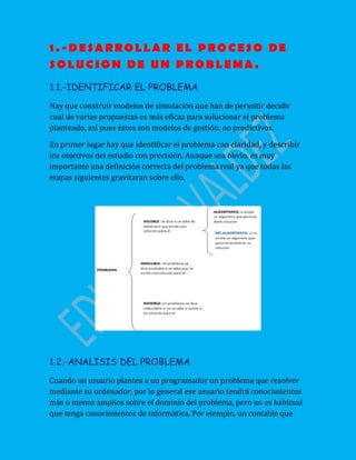 El documento describe las etapas para resolver un problema mediante la creación de modelos de simulación. Estas etapas incluyen: 1) identificar el problema con claridad, 2) analizar el problema obteniendo la experiencia de expertos, 3) elaborar algoritmos mediante una notación algorítmica, 4) elaborar diagramas de flujo mostrando los pasos de la solución, 5) crear pseudocódigo para facilitar la comprensión del algoritmo, y 6) realizar pruebas de escritorio del algoritmo sin ejecutarlo.