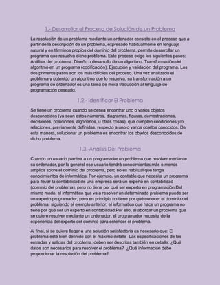 Este documento presenta los pasos para resolver problemas mediante programación: 1) Análisis del problema, 2) Diseño de un algoritmo, 3) Codificación del algoritmo como un programa, 4) Ejecución y validación del programa. Explica que el análisis del problema y el diseño del algoritmo son las partes más difíciles del proceso. También describe técnicas como diagramas de flujo y pseudocódigo que pueden usarse para diseñar algoritmos de manera gráfica o narrativa.