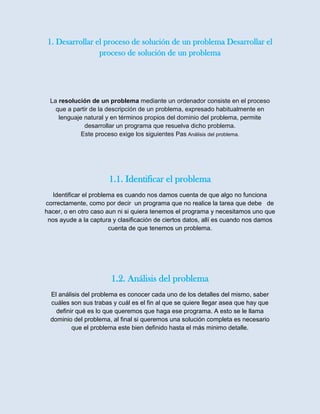 Este documento describe las etapas del proceso de resolución de problemas mediante programación: 1) identificar y analizar el problema, 2) elaborar algoritmos para resolverlo, 3) crear diagramas de flujo para entender los algoritmos, 4) generar pseudocódigo para diseñar el programa, y 5) realizar pruebas de escritorio para verificar que la solución funciona correctamente. Explica cada etapa en detalle para desarrollar completamente la solución a un problema usando programación.