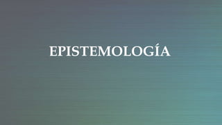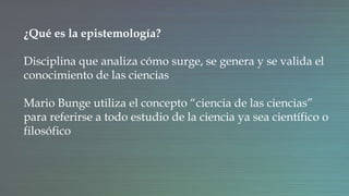La epistemología estudia cómo se genera y valida el conocimiento científico, examinando conceptos como la relación entre sujeto y objeto, los orígenes y límites del conocimiento, y los métodos científicos. Analiza factores históricos, sociales y psicológicos que influyen en el conocimiento, y clasifica enfoques metacientíficos, paracientíficos y científicos. Su función es justificar datos científicos considerando estos factores.