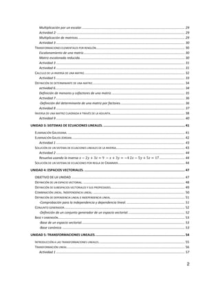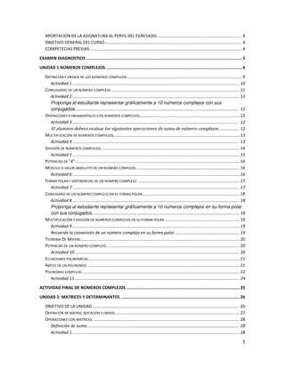 Este documento presenta los temas centrales de un curso de álgebra lineal. Introduce los números complejos, incluyendo su definición, representaciones y operaciones. Luego cubre matrices y determinantes, sistemas de ecuaciones lineales, espacios vectoriales y transformaciones lineales. El objetivo general es resolver problemas de ingeniería utilizando estas herramientas matemáticas.