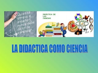 El documento presenta diferentes perspectivas sobre la didáctica. Émile Durkheim y John Dewey definen la ciencia como aquello que estudia los hechos empíricamente observables y utiliza métodos sistemáticos de investigación. Mario Bunge sostiene que la ciencia es un conjunto de conocimientos sistemáticos, exactos y verificables. La didáctica se presenta como una ciencia que estudia el proceso educativo dirigido a preparar al hombre para la vida. La didáctica también se define como un arte, donde el maestro utiliza su insp