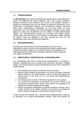 Este documento proporciona una introducción general a la microbiología. Explica que la microbiología es el estudio de los microorganismos como bacterias, hongos y protozoos. Detalla los diferentes tipos de microbiología como la microbiología médica, ambiental e industrial. También resume brevemente la historia de la microbiología y los descubrimientos clave de científicos como Van Leeuwenhoek, Pasteur y Koch.