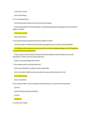 Access 2010 puede cerrarse desde el menú Archivo > Salir o presionando CTRL + F4. La cinta de opciones contiene herramientas organizadas en pestañas y grupos según su función, y puede ocultarse. La barra de estado muestra información cambiante en la parte inferior del programa.