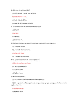 Access 2010 se puede cerrar desde el menú Archivo > Salir, pulsando ALT+F4, o cerrando la ventana principal. La cinta de opciones contiene herramientas organizadas en pestañas y grupos, y se puede ocultar o mostrar. Muchas acciones tienen teclas rápidas y se pueden realizar sin ratón. La ayuda y documentación están disponibles pulsando F1 o en el menú Archivo.