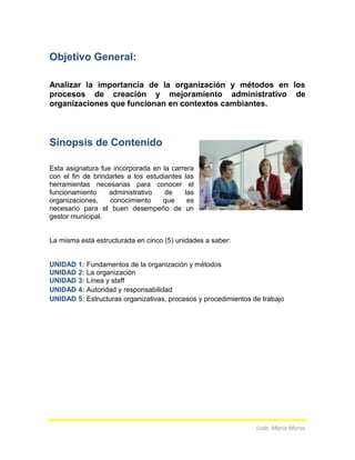 Este documento presenta una introducción a la asignatura Organización y Métodos impartida en la Licenciatura en Administración y Gestión Municipal en Venezuela. La asignatura analiza la importancia de la organización y los métodos en los procesos administrativos de las organizaciones. Está estructurada en cinco unidades que cubren temas como los fundamentos de la organización, la estructura organizativa, la autoridad y la responsabilidad.