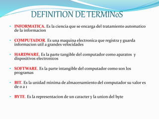 El documento define términos clave de informática como computador, hardware, software, y describe dispositivos de entrada, salida y almacenamiento comunes como el teclado, monitor, unidad de disco duro y memoria USB. Explica que la computadora es una máquina electrónica que procesa información a gran velocidad utilizando programas y dispositivos electrónicos.