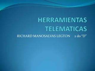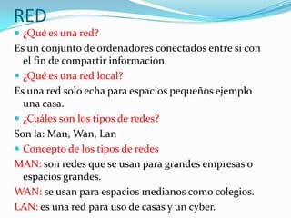 Este documento describe diferentes aspectos de las redes y la Internet. Explica los tipos de redes como MAN, WAN y LAN, y los protocolos de red TCP/IP y el modelo OSI. También describe los usos de la Internet como almacenamiento en la nube, trabajo en línea, redes sociales y chat. Finalmente, señala que la Internet se ha convertido en una herramienta fundamental en el siglo 21, permitiendo el aprendizaje a distancia a través de aulas virtuales.