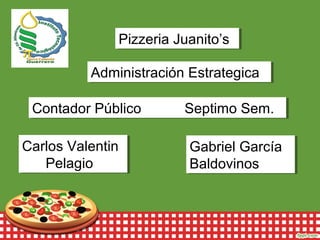 La Pizzería Juanito's ha experimentado una disminución en los ingresos en los últimos meses y busca implementar una mejor administración para recuperar o aumentar los ingresos diarios de $1,000. Entre sus fortalezas se encuentran su ubicación céntrica, variedad de productos y aceptación de los clientes, mientras que entre sus debilidades están la falta de registros financieros, mal servicio y entregas en carro. Se proponen estrategias como ampliar la variedad de productos, entregas a domicilio en motocicleta y