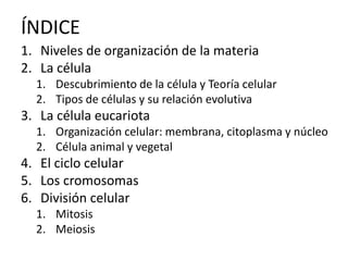 Este documento resume los principales conceptos sobre la organización celular de los seres vivos. Explica que todas las células están constituidas por una membrana, citoplasma y núcleo. Describe las diferencias entre células procariotas y eucariotas, y los orgánulos celulares como las mitocondrias, cloroplastos y aparato de Golgi. También resume los procesos de división celular de mitosis y meiosis, cómo se distribuyen los cromosomas durante estos procesos y su importancia para el crecimiento, des