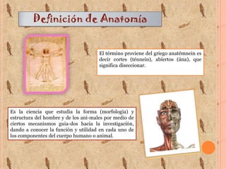 La anatomía estudia la forma y estructura del cuerpo humano mediante la disección para comprender la función de sus componentes. Se remonta a los egipcios y griegos antiguos como Hipócrates y Aristóteles, y ha evolucionado gracias a anatomistas como Galeno. En la actualidad, se utilizan términos estándar para describir posiciones, planos, movimientos y regiones anatómicas a fin de comunicar con precisión la localización y relación de los tejidos y órganos.