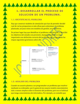 El documento describe las etapas para resolver un problema mediante la creación de modelos de simulación. Estas etapas incluyen: 1) identificar el problema con claridad, 2) analizar el problema obteniendo la experiencia de expertos, 3) elaborar algoritmos mediante notación algorítmica, 4) elaborar diagramas de flujo mostrando los pasos, 5) crear pseudocódigo para facilitar la comprensión del algoritmo, y 6) realizar pruebas de escritorio sin ejecutarlo realmente.