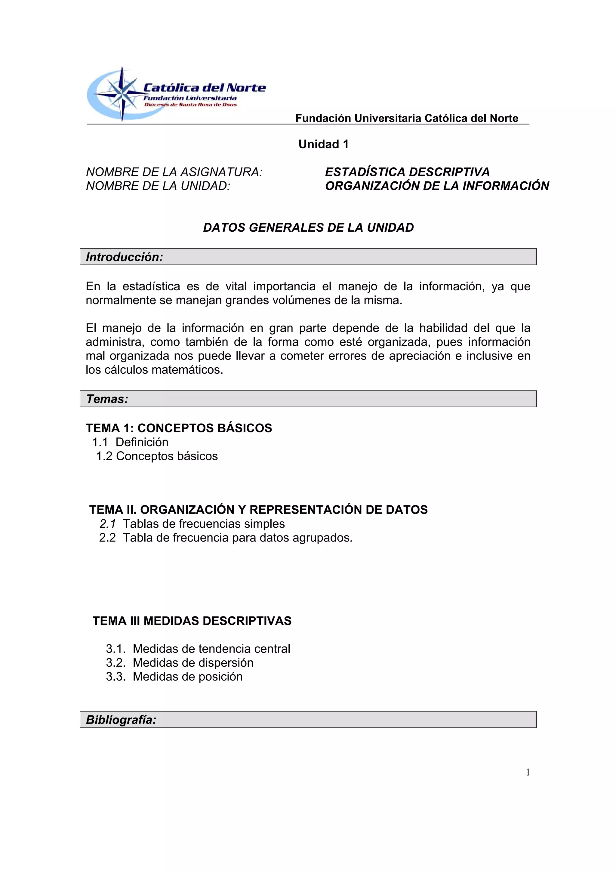 Este documento presenta la unidad 1 de la asignatura de Estadística Descriptiva. La unidad se enfoca en la organización de la información y contiene 3 temas: conceptos básicos, organización y representación de datos, y medidas descriptivas. El documento explica conceptos como población, muestra, variables cualitativas y cuantitativas, y cómo construir tablas de frecuencias para organizar y representar datos agrupados y no agrupados.