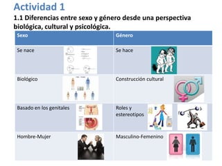 Este documento presenta información sobre el concepto de género y la equidad de género. Explica la diferencia entre sexo y género desde perspectivas biológicas, culturales y psicológicas. También describe algunos hitos históricos del movimiento feminista en los siglos 18, 19 y 20, así como las condiciones actuales de las mujeres en las sociedades contemporáneas. Finalmente, incluye ejercicios para analizar la participación e invisibilidad de las mujeres a lo largo de la historia.