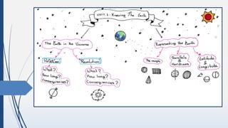 La unidad 1 del documento aborda conceptos fundamentales sobre la Tierra, como la rotación y traslación, que explican la duración de los días y las estaciones. También se introducen los puntos cardinales, husos horarios, la definición de mapas, paralelos y meridianos, así como la latitud y longitud. Adicionalmente, se menciona la importancia de la escala y la leyenda en los mapas.