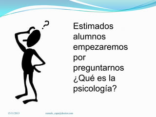 Este documento presenta una discusión sobre la relación entre la filosofía y la psicología. Explica que la psicología se originó como una rama de la filosofía y aún se basa en conceptos filosóficos para abordar problemas fundamentales como la naturaleza humana y la relación entre la mente y el cuerpo. Luego, revisa las perspectivas históricas sobre la mente y el cuerpo desde la antigüedad griega hasta la Edad Media, cuando las ideas platónicas y aristotélicas influyeron en el dual
