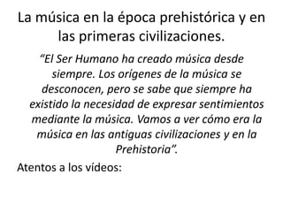 Este documento resume la música en la Prehistoria y las primeras civilizaciones. Explica que la música ha existido desde siempre como forma de expresión humana. En la Prehistoria se usaban objetos del entorno como instrumentos y se creaba música de forma rudimentaria. Las primeras civilizaciones desarrollaron más los instrumentos musicales pero la música siempre ha formado parte de las culturas humanas.