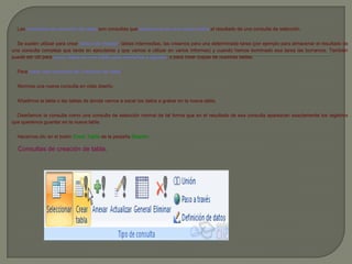 Las consultas de acción permiten realizar cambios en los datos almacenados, como crear, modificar, insertar o eliminar registros. Específicamente, las consultas de creación de tabla almacenan los resultados de una consulta de selección en una nueva tabla, lo que es útil para crear tablas de trabajo o copias de datos. Para crear una consulta de creación de tabla, se seleccionan los datos de una o más tablas existentes y se almacenan los resultados en una nueva tabla.