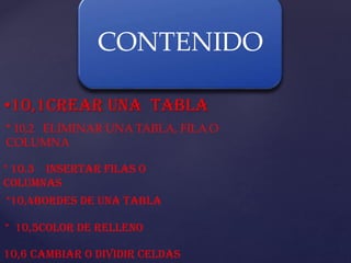 Este documento presenta información sobre cómo crear y modificar tablas en PowerPoint. Explica cómo insertar una nueva tabla, eliminar filas y columnas, agregar bordes y cambiar el color de relleno de las celdas. También cubre cómo combinar y dividir celdas dentro de una tabla existente.