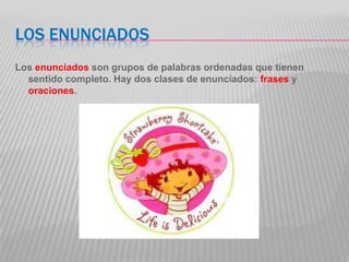 El documento habla sobre los enunciados, frases y oraciones, explicando que las frases no tienen forma verbal mientras que las oraciones sí. Luego explica que las oraciones constan de un sujeto y un predicado, donde el sujeto es la persona, animal o cosa de que se habla y el predicado es lo que se dice sobre el sujeto. Finalmente, menciona que el núcleo del sujeto suele ser un sustantivo que puede ir acompañado de determinantes u otros complementos.