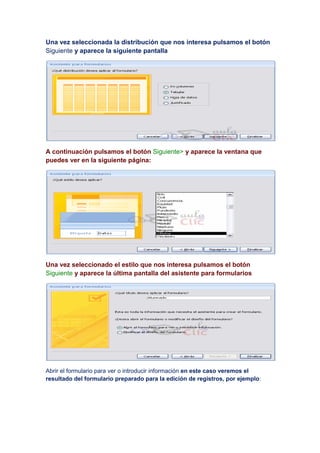 Este documento describe cómo crear formularios en Access, incluyendo el uso del asistente de formularios, la adición de controles, y el diseño y formato del formulario. Explica los diferentes tipos de controles que se pueden agregar, como cuadros de texto, botones y casillas de verificación. También cubre cómo alinear y ajustar el tamaño de los controles, y modificar el diseño general del formulario.
