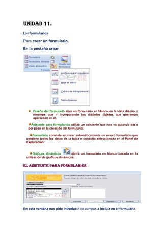 Este documento describe cómo crear formularios en Access, incluyendo el uso del asistente de formularios, la adición de controles, y el diseño y formato del formulario. Explica los diferentes tipos de controles que se pueden agregar, como cuadros de texto, botones y casillas de verificación. También cubre cómo alinear y ajustar el tamaño de los controles, y modificar el diseño general del formulario.