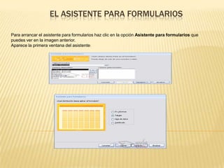 Este documento describe las herramientas de Access para crear formularios, incluyendo el diseño manual de formularios, el asistente de formularios, y las opciones de diseño de formularios. Explica cómo usar el asistente para elegir un estilo y agregar campos de datos al formulario, y cómo ver y editar datos en el formulario resultante. También cubre cómo trabajar con controles en el diseño de formularios, incluyendo cambiar su tamaño.