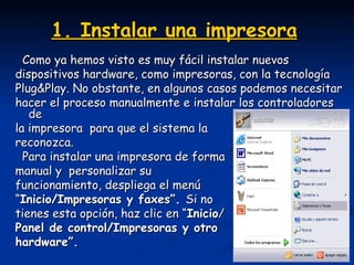 Este documento proporciona instrucciones para configurar e instalar impresoras en Windows. Explica cómo agregar una impresora mediante el asistente de instalación, ver y administrar la cola de impresión, compartir una impresora en red, y establecer las preferencias y propiedades de la impresora como la orientación, calidad y tipo de papel.
