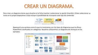 Este documento proporciona instrucciones sobre cómo crear y editar diagramas SmartArt en PowerPoint. Explica cómo insertar un diagrama, agregar y eliminar formas, organizar las formas, convertir texto a diagrama y viceversa, y utilizar las herramientas de diseño y formato para editar el diagrama.